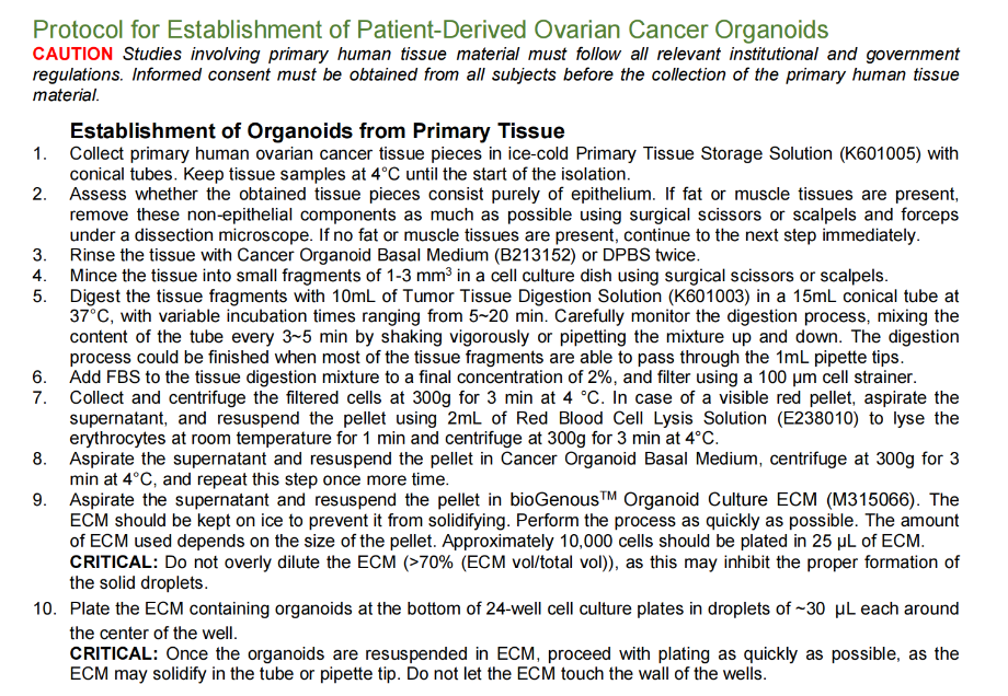 bioGenousTM Ovarian Cancer Organoid Kit is a serum-free cell culture medium for the establishment and maintenance of human ovarian cancer organoids. Patient-derived cancer organoids recapitulate the genomic and pathological features of original tumors and therefore hold great promise for medical research and precision medicine.