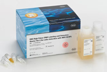 DIG High Prime DNA标记及检测起始试剂盒I使用类固醇半抗原地高辛(DIG),通过酶促免疫检测标记DNA探针标记,以便进行杂交和后续显色检测。此试剂盒包含即用型封闭液——由硝基四氮唑蓝(NBT)/ 5-溴-4-氯-3-吲哚基磷酸酯(BCIP和DIG Easy Hyb颗粒组成的综合储备液。DIG-High Prime混合物包括稳定的Klenow酶、核苷酸、引物和反应缓冲液——所有成分均溶于一种方便的试剂中。样品材料可以是:至少100 bp的DNA片段,线性化质粒,cosmid或λ DNA,或超螺旋DNA“随机结合的”DNA标记方法首先由Feinberg和Vogelstein开发,基于将所有可能序列的寡核苷酸杂交至待标记的变性DNA。初始加入的DNA仅作为标记DNA的合成模板,在反应过程中不会降解,因而可标记极少量的DNA(10 ng)。该方法借助Klenow聚合酶,以随机寡核苷酸的3′-OH末端为引物,合成互补DNA链。反应物中存在洋地黄毒苷标记的修饰脱氧核糖核苷三磷酸掺入新合成的互补DNA链中。这种便捷的试剂盒可通过碱不稳定的DIG-11-dUTP随即引发标记DNA模板,显色检测DIG标记杂交产物。我们致力于为您提供更环保的替代产品,以符合“绿色化学的12项原则”的一项或多项原则要求。该产品为一种安全的化学品。 DIG系统是灵敏且具有成本效益的方案,可替代核酸放射性标记和检测。有许多已发表论文证明了DIG系统的通用性,因此,使用放射性标记不再是标记用于杂交的DNA的唯一选择。